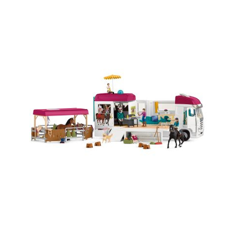 Lisa és családja 3 lovukkal a következő lovasbemutatóra utazik. A lószállítóban a lovak biztonságosan és kényelmesen utazhatnak. A bemutató helyszínén egy kifutót állítanak fel a lovaknak. A tetőn egy medence kapott helyet, ahol kipihenhetik az út fáradalmait. A vacsora is meg van oldva a grillező felállításával, ahol az egész család össze tud gyűlni. Körülöttük ugrál a golden retriever kutyájuk, várja a leeső falatokat. Minden Schleich® figura aprólékosa