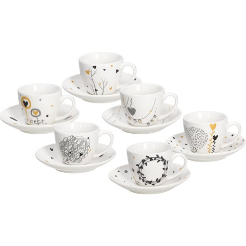 Csésze készlet tea felszolgálására - csészealjjal, anyaga porcelán, űrtartalma 80 ml, alkalmas mosogatógépbe és mikrohullámú sütőbe, mintával, 6 db a csomagban Élvezd a kávédat vagy a teádat az elegáns Tognana IRIS GOLDY csészékből. Az ízléses készlet 6 darab 80 ml-es csészét és 6 darab csészealjat tartalmat. A fehér színű, minőségi porcelán szett darab