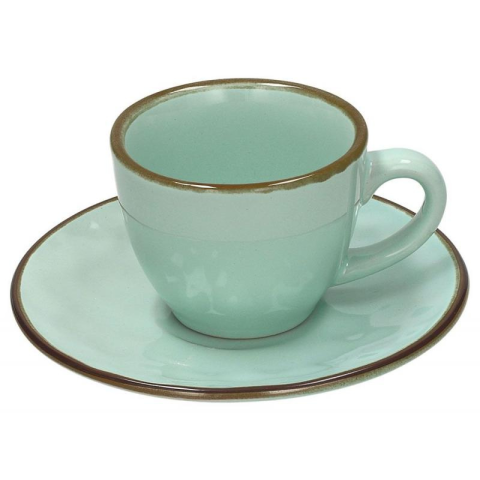 6 személyes kerámia mokkás készlet, kellemes pasztelzöldes színben. A csészék űrtartalma: 10 cl (100 ml), magasságuk: 7 cm, a csézealátétek átmérője: 12,7 cm.
