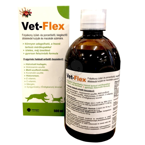 VetFlex Folyékony ízület- és porcerősítő, kiegészítő állateledel kutyák és macskák számára - könnyen adagolható, a hozzá tartozó mérőkupakkal- ízletes, máj ízesítésű- gyorsan felszívódó formula   9 egymás hatását erősítő összetevő: Hidrolizált kollagén, Glükózamin-szulfát, Metil-szulfoníl-metán, Kondroitin-szulfát, Hialuronsav, E- vitamin, C-vitamin, Mangán, Gyógynövény (Ördögkarom) kivonat. A hidrolizált kollagén, a mangán és a C-vitami