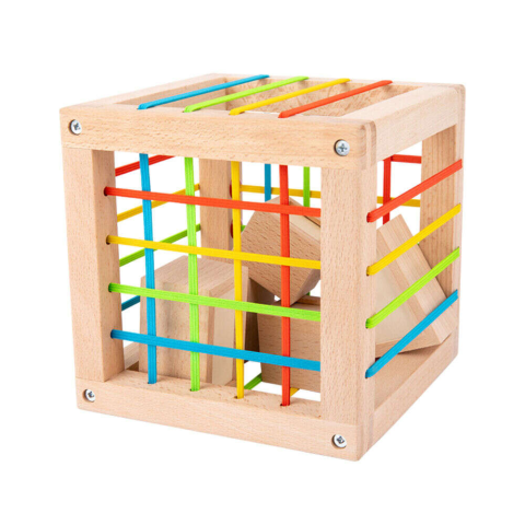 Felfedező kocka fejlesztő játék kisgyerekeknek. A készlet 1 db nagy kockát és 5 db pici geometriai testet tartalmaz. A nagy kocka oldala színes gumipántokkal van átszőve, melyek lehetővé teszik a formák könnyű be és kihelyezését. A kisebb testek csörgő hangot adnak ki.