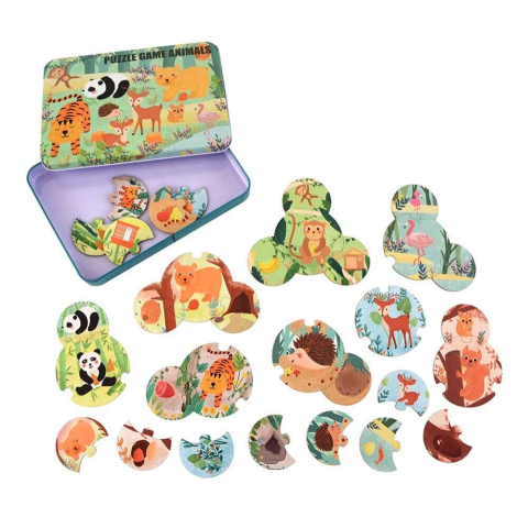 A finommotorikát és logikus gondolkodást fejlesztő kirakó játék. A készlet állatokat ábrázol (majom, panda, flamingó, tigris, sün, őz, medve,mókus), melyeknek meg kell keresni a táplálékát, élőhelyét, és kicsinyét. Ezáltal a környezeti nevelést is támogatja. Az állatgrafikák kedvesek, színviláguk harmonikus. A terméket praktikus, fém, zárható dobozban szállítjuk.