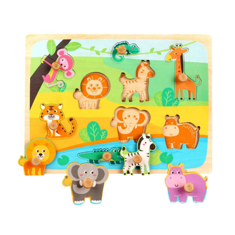 Fogantyús 3D puzzle, szafaris állat mintával. Fejleszti a finommotorikát, megfigyelőképességet, formaérzéket, szem-kéz koordinációt. A játéktábla szavanna élővilágát ábrázolja, melyre különböző állatokat kell beilleszteni. Minden forma fogantyúval van ellátva, mely megkönnyíti az elhelyezésüket.