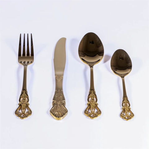 TOO KT-477 Royal 16 db-os evőeszköz készlet. - Anyag: rozsdamentes acél, aranyszínű bevonattal - Mosogatógépben mosható Tartalma: - 4db étkezőkés 23,8cm, 90g - 4db evőkanál 20,3cm, 50g - 4db vil...