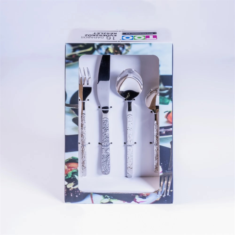 TOO KT-478 Stone 16 db-os evőeszköz készlet Tartalma: - 4db étkezőkés 6 x 22,5cm, 73g - 4db evőkanál 4 x 20,6cm, 60g - 4db villa 4 x 21cm, 45g - 4db teáskanál 4 x 16cm, 35g - Anyag: rozsdamentes...