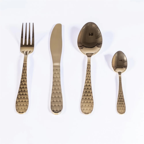 TOO KT-479 S Honey 16 db-os evőeszköz készlet. - Anyag: rozsdamentes acél, aranyszínű bevonattal - Bordázott nyél - Mosogatógépben mosható Tartalma: - 4db étkezőkés 6 x 23cm, 78g - 4db evőkanál...
