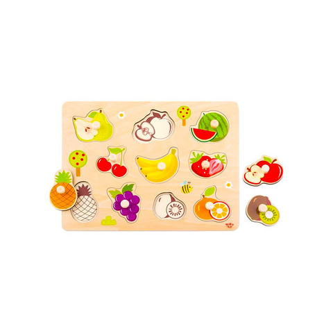 A formakirakó egy vidám, szórakoztató és nem utolsó sorban remek fejlesztő játék a legkisebbek számára.A piciknek nincs más dolguk, mint megragadni az aranyos, fogantyúval ellátott zöldségeket, majd a helyükre illeszteni. Ebben a szettben 10 darab gyümölcs található - körte, alma, dinnye, cseresznye, banán, eper, ananász, szőlő, kivi, narancs -, így a gyerekek játék közben az egészséges ételekkel is megismerkedhetnek. Minden gyümölcsnek külön helye van, azonb