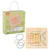 A gyerekek elkészíthetik egyedi, gumigyűrűs képeiket ezzel a szegecselt fatáblát, sablonokat és színes gumikat tartalmazó készlettel. A különböző nehézségű kártyalapok útmutatóul szolgálnak a képek elkészítéséhez és az ötletekhez. A gumikat a kiálló pöttyökre kell helyezni négyzet, háromszög, rombusz és egyéb alakzatokban, hogy elkészüljön az alkotás. A csomag 48 darab színes gumiszalagot és 40 darab 3 nehézségi fokozatú sablont tartalmaz.A játék