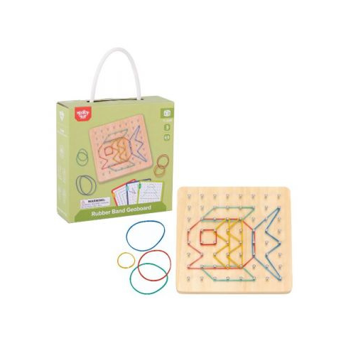 A gyerekek elkészíthetik egyedi, gumigyűrűs képeiket ezzel a szegecselt fatáblát, sablonokat és színes gumikat tartalmazó készlettel. A különböző nehézségű kártyalapok útmutatóul szolgálnak a képek elkészítéséhez és az ötletekhez. A gumikat a kiálló pöttyökre kell helyezni négyzet, háromszög, rombusz és egyéb alakzatokban, hogy elkészüljön az alkotás. A csomag 48 darab színes gumiszalagot és 40 darab 3 nehézségi fokozatú sablont tartalmaz.A játék