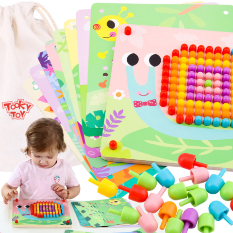 A Tooky Toy színes tűs kirakós játék tökéletes választás a legkisebb gyerekek számára, akik kreativitásukat és kézügyességüket szeretnék fejleszteni játék közben. A színes képekkel ellátott fatáblákon a gyerekek különböző színű tűk segítségével alkothatna