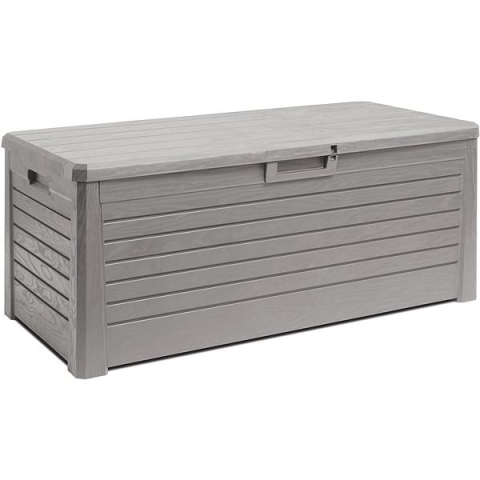 Kerti tárolódoboz - műanyag, fedélzáró pántok és lezárási lehetőség, űrtartalma 550 l, ellenálló UV sugárzás ellen, fedél teherbírása 320 kg, mérete 60 × 148 × 72 cm (Ma×Sz×Mé), fa imitáció, szürke kivitel, tömege 18000 g A megbízható, 550 l űrtartalmú TOOMAX kerti tárolódoboz ideális megoldás a kerti szerszámok és egyéb apróságok biztonságos tárolására, mert rengeteg helyet kínál. Műanyag felépítésének köszönhetően kö