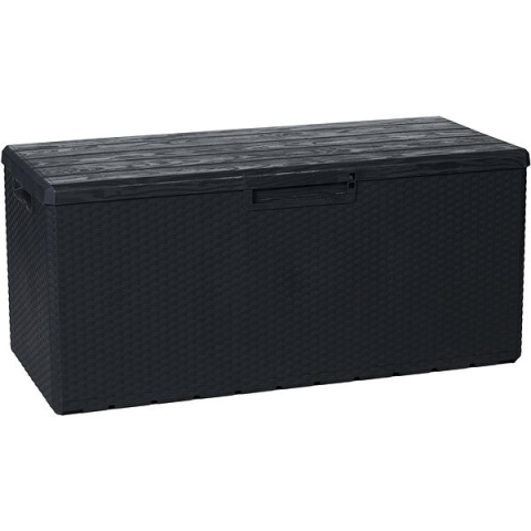 Kerti tárolódoboz - műanyag, lezárási lehetőség, űrtartalma 340 l, ellenálló UV sugárzás ellen, fedél teherbírása 250 kg, mérete 56 × 124 × 55 cm (Ma×Sz×Mé), műrattan, fekete kivitel, tömege 11000 g A minőségi, 340 l űrtartalommal rendelkező TOOMAX kerti tároló láda szárazon és kéznél tartja szerszámaidat és kerti tartozékaidat. A műanyag szerkezet könnyű, gyorsan és könnyedén tisztítható, és nem