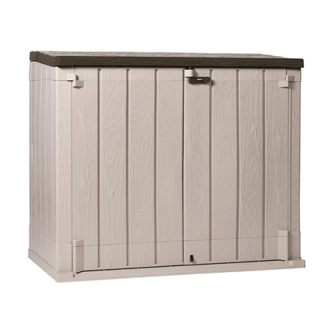 Kerti tároló szekrény - műanyag, zárható, UV álló és vízálló, mérete 124 × 145 × 85 cm (Ma×Sz×Mé), tömege 25 kg, bézs és barna kivitel A remek TOOMAX műanyag kültéri tároló szekrény használatával szerszámaidat, kerti kiegészítőidet és tisztítószereidet egy helyen tárolhatod. A zárómechanizmus biztosítja, hogy csak az arra jogosultak