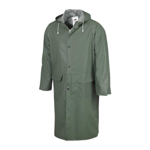 TOP NIAGARA PVC kabátVastag vízálló PVC bevonatos kabát.Anyaga: 100% PVC/Polyester.120 cm hosszú.Zöld színű.Szellőzőnyílások a háton és hónaljnál.Összehúzható kapucni.Nagy zsebek.A karok végén vízzárók.