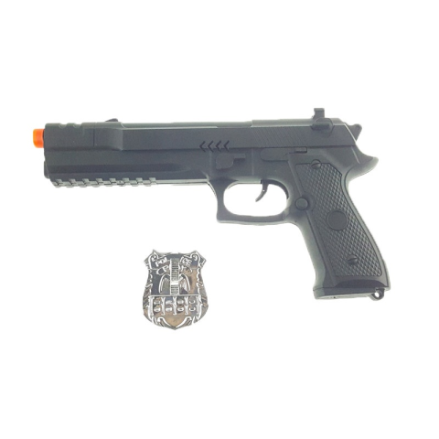 Élethű kinézetű játék fegyver. A ravasz meghúzására a fegyver kattogó hangot ad ki. A fegyverhez egy rendőrségi jelvény is tartozik. Mérete: 31x19x4 cm Anyaga: Műanyag