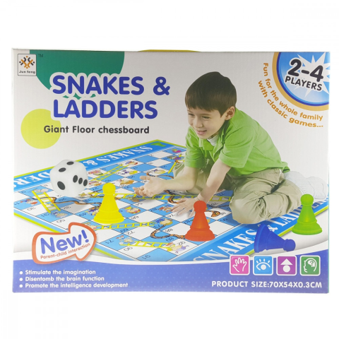 Igazi klasszikus Kígyók és Létrák társasjáték , nagy méretű szőnyeges kivitelben (70x54 cm) , puha játékfigurákkal . Akár több dobókockával is játszható . Egyszer fent, egyszer lent. Klasszikus társasjáték, ahol a létrára lépve a játékos a létra tetejé