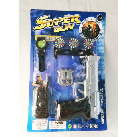 Rendőr készlet lapra csomagolva 3 év felettieknek Játszd el a rendőr szerepét ezzel a szettel! Minden a csomagban ami a rendfenntartáshoz szükséges. A jelvény a hitelességet is igazolja. Mérete: fegyver: kb.28cm Anyaga: műanyag