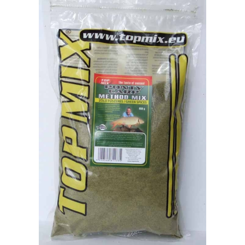 A Zöld Fűszeres Method Mix a TOP MIX egyik legszélesebb körben felhasználható etetőanyaga. Egyaránt használható verseny és kedvtelési célú horgászatoknál. Többféle ponty pellet örleményének keverékéből készül. Speciális és igen hatásos aromakeveréke alkalmassá teszi ponty, keszegfélék és kárász horgászatához kora tavasztól késő őszig. Semmihez sem hasonlítható különleges fűszeres jellege mágnesként vonzza a halakat a horgunkhoz akkor is, amikor m
