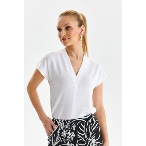 Blúz Model 179437 Top Secret MM-179437. Színe: FehérA kényelemmel és nagyszerű viselhetőséggel teli női blúz egyszerű, laza szabású, finom állógallérral és feltűnő V alakú nyakkivágással rendelkezik. Nagyon rövid kimonó ujjakkal rendelkezik, és gyönyörűen ül a női testen, kiemelve az alak karcsúságát. Kiváló minőségű és kellemes tapintású kötött anyagból készült, amely simaságával és páratlan puhaságával r