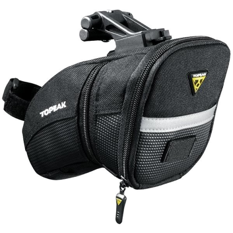 Kerékpáros táska - elhelyezése nyereg alá, térfogata 0,98 l, vízlepergető, ellátva gyorscsatlakozós rendszerrel, belső zseb, fényvisszaverő elemek, pánt lámpa rögzítéséhez és belső rendszerező, mérete 12 × 20 × 12 cm (Ma×Sz×Mé), tömege 0,135 kg, fekete kivitel A TOPEAK AERO WEDGE PACK Medium nyeregtáska QuickClick rendszerrel egy univerzális és praktikus megoldás a mindennapi kerékpározáshoz, amely a gyors rögzítésre és az aerodinamikára helyezi a hangsú