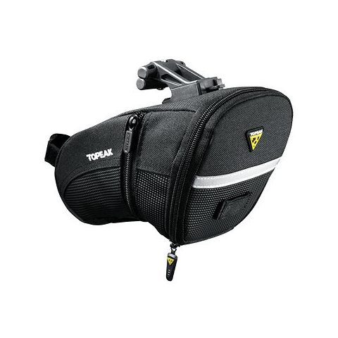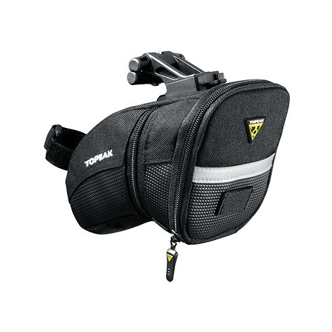 Kerékpáros táska - elhelyezése nyereg alá, térfogata 2 l, vízlepergető, ellátva gyorscsatlakozós rendszerrel, belső zseb, fényvisszaverő elemek, pánt lámpa rögzítéséhez és belső rendszerező, mérete 14 × 21 × 12,5 cm (Ma×Sz×Mé), tömege 0,176 kg, fekete kivitel A TOPEAK AERO WEDGE PACK Large nyeregtáska QuickClick rendszerrel egy univerzális és tágas megoldás azoknak a kerékpárosoknak, akik nagyobb kapacitást és gyors rögzítést igényelnek. A táska a Quick