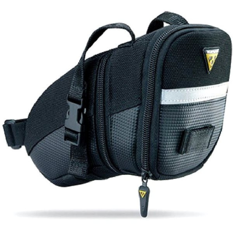 Kerékpáros táska - elhelyezése nyereg alá, térfogata 0,98 l, vízlepergető, ellátva tépőzárakkal, belső zseb, fényvisszaverő elemek, mérete 12 × 20 × 11 cm (Ma×Sz×Mé), tömege 0,13 kg, fekete kivitel A TOPEAK AERO WEDGE PACK Medium nyeregtáska pántokkal aerodinamikus formát, praktikus rögzítést és elegendő helyet kínál a szükséges kerékpáros felszereléseknek. Az ellenálló 1200 denier poliészterből