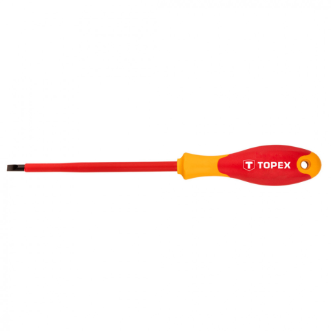 A TOPEX lapos csavarhúzó 1000 V a legfeljebb 1000 V feszültség melletti munkákra szolgál. Kiváló minőségű króm-molibdén acélból készül, szigetelt. Az ergonómikus, csúszásmentes anyaggal bevont műanyag markolat biztosítja a kényelmet és a biztonságot a mun