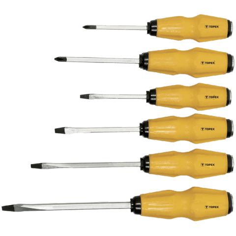 A TOPEX üthető csavarhúzó készlet ragasztott, erősen meghúzott csavarok be- és kicsavarására szolgál. Mindegyikük szára nagy ellenállóképességű, a szerszámnak hosszú élettartamot biztosító króm-vanádium acélból készült. A mágneses hegy megkönnyíti a szers