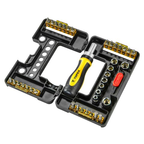 TOPEX Csavarbehajtó bitek és dugókulcsok hajtókarral (ref. sz. 39D3441), 38 db-os készlet, műanyag csomagolásban elrendezve. Minden eleme a termék hosszú élettartamát biztosító, kimagasló minőségű króm-vanádium ötvözetből készül. A készletben dugókulcsok,