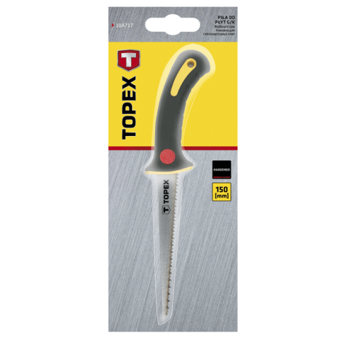 TOPEX 150 mm hosszú pengéjű gipszkarton fűrész. Vastagabb, keményebb a pengéje, mint a többi fűrésznek, lyukak vágására szolgál gipszkarton lapokban. A fűrészpenge kiváló minőségű edzett acélból készül. A fogak kétsíkú élezése csökkenti a vágási ellenállást. Az ergonómikus műanyag markolat segíti a precíz vezetést, a csúszásmentes bevonat pedig megakadályozza kicsúszását a kézből, jelentősen javítva a használati kényelmet. A TOPEX márka ezerme