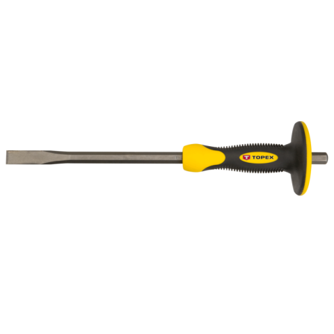 A TOPEX véső kemény anyagok vésésére, zúzására szolgál. Lapos élben végződik, kiváló minőségű, nagy szilárdságú króm-vanádium acélötvözetből készül. A kézből való kicsúszást megakadályozó, a munka kényelmét növelő ergonómikus markolattal. Előnye a kezeket az ütésektől védő kézvédő gallér. A TOPEX márka ezermestereknek készül.