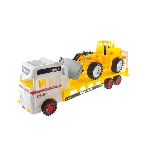 Kamion, amely munkagépet szállít. Az első kereke lendkerekes. Csomagolás: 315x125x75 Méret: 31.5 cm Anyaga: műanyag
