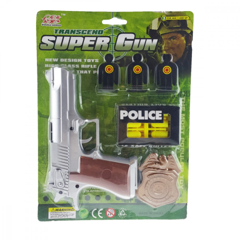 Szivacs lövő pisztoly, 3 éves kor felett. 4 részes szuper műanyag pisztoly 3 év feletti gyerekek részére. A csomagolás tartalmaz: 1 db ezüst színű élethű pisztoly barna markolattal. 12 db puha hab töltény 1 db Police azonosító jelvény 3 db céltábla A