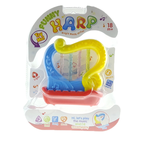 Zenélő hárfa, altatót, állathangokat, és dalokat játszik le. A zene nyugtató hatással van a gyermekekre miközben segíti fejlődésüket. A hangok mellé színes fényekkel is leköti a figyelmüket. 18 hónapos kortól ajánlott. Anyaga: műanyag Mérete: 11cm A ze