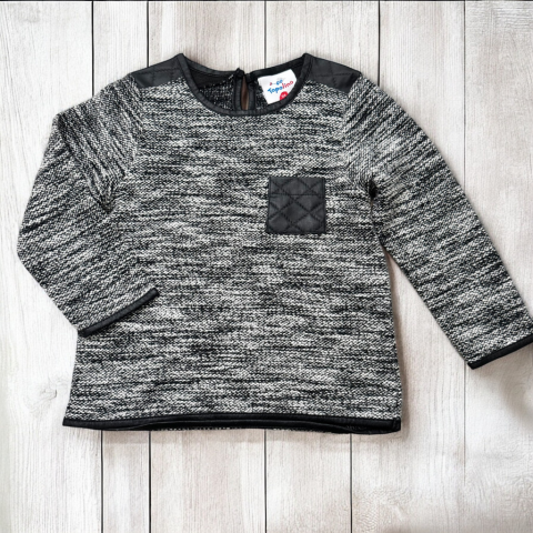 Csinos szürke pulóver Egyenes szabású, kerek nyakkivágású, hátán egy gombbal záródik. Elején bőr hatású zsebbel. Hibátlan állapotú.