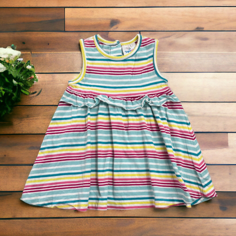 Bőszabású, hátán 2 gombbal záródik, mell alatt fodorral. Kellemes pamut viselet, vidám színes csíkos anyag. mell:2x25cm hossz:44cm Hibátlan állapotú.