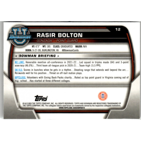 1 kép Topps 2022-23 Bowman Chrome University #12 Rasir Bolton