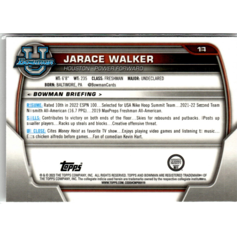 Az eladásra kínált 2022-23 Bowman Chrome University #14 Jarace Walker kosaras kártya NM-MT állapotban van. A kosaras kártyákat legtöbb esetben UP Platinum/Standard puha védőtokban és/vagy UP Toploader (kemény védőtok)-ben küldjük. Az eladásra kínált