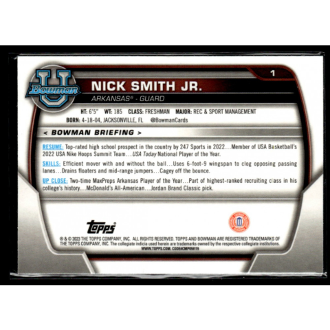 Az eladásra kínált 2022-23 Bowman Chrome University #1 Nick Smith Jr. kosaras kártya NM-MT állapotban van. A kosaras kártyákat legtöbb esetben UP Platinum/Standard puha védőtokban és/vagy UP Toploader (kemény védőtok)-ben küldjük. Az eladásra kínált