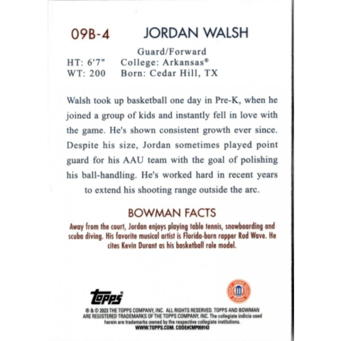 Az eladásra kínált 2022-23 Bowman Chrome University 2009 #09B-4 Jordan Walsh kosaras kártya NM-MT állapotban van. A kosaras kártyákat legtöbb esetben UP Platinum/Standard puha védőtokban és/vagy UP Toploader (kemény védőtok)-ben küldjük. Az eladásra