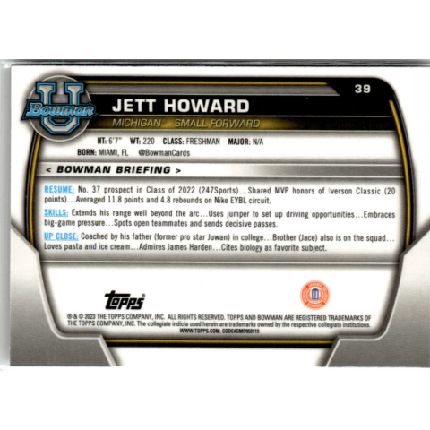 Az eladásra kínált 2022-23 Bowman Chrome University #39 Jett Howard kosaras kártya NM-MT állapotban van. A kosaras kártyákat legtöbb esetben UP Platinum/Standard puha védőtokban és/vagy UP Toploader (kemény védőtok)-ben küldjük. Az eladásra kínált 20