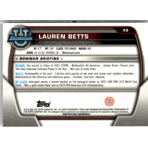 Az eladásra kínált 2022-23 Bowman Chrome University #49 Lauren Betts kosaras kártya NM-MT állapotban van. A kosaras kártyákat legtöbb esetben UP Platinum/Standard puha védőtokban és/vagy UP Toploader (kemény védőtok)-ben küldjük. Az eladásra kínált 2
