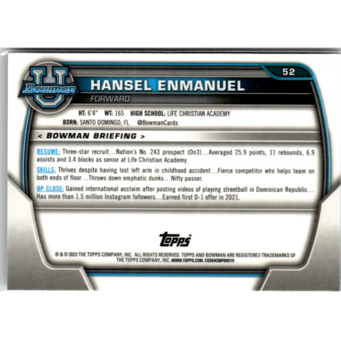 Az eladásra kínált 2022-23 Bowman Chrome University #52 Hansel Enmanuel kosaras kártya NM-MT állapotban van. A kosaras kártyákat legtöbb esetben UP Platinum/Standard puha védőtokban és/vagy UP Toploader (kemény védőtok)-ben küldjük. Az eladásra kínál