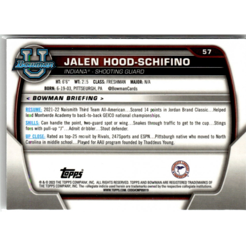 Az eladásra kínált 2022-23 Bowman Chrome University #57 Jalen Hood-Schifino kosaras kártya NM-MT állapotban van. A kosaras kártyákat legtöbb esetben UP Platinum/Standard puha védőtokban és/vagy UP Toploader (kemény védőtok)-ben küldjük. Az eladásra k