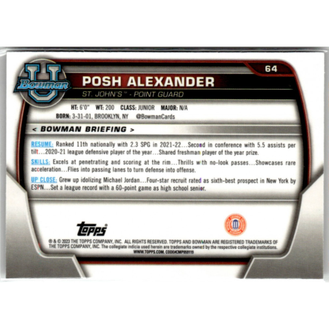 Az eladásra kínált 2022-23 Bowman Chrome University #64 Posh Alexander kosaras kártya NM-MT állapotban van. A kosaras kártyákat legtöbb esetben UP Platinum/Standard puha védőtokban és/vagy UP Toploader (kemény védőtok)-ben küldjük. Az eladásra kínált