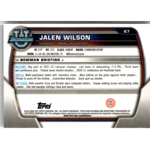 Az eladásra kínált 2022-23 Bowman Chrome University #67 Jalen Wilson kosaras kártya NM-MT állapotban van. A kosaras kártyákat legtöbb esetben UP Platinum/Standard puha védőtokban és/vagy UP Toploader (kemény védőtok)-ben küldjük. Az eladásra kínált 2