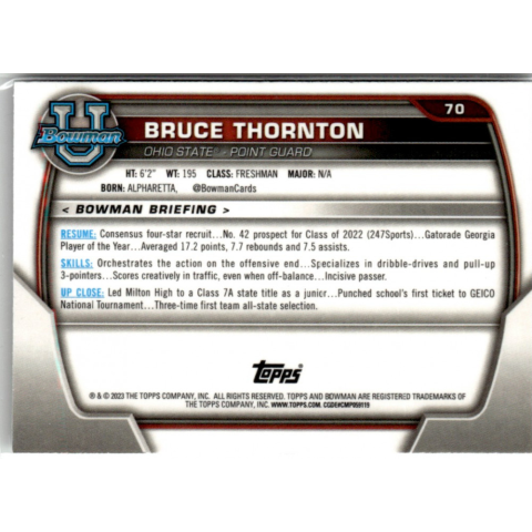 Az eladásra kínált 2022-23 Bowman Chrome University #70 Bruce Thornton kosaras kártya NM-MT állapotban van. A kosaras kártyákat legtöbb esetben UP Platinum/Standard puha védőtokban és/vagy UP Toploader (kemény védőtok)-ben küldjük. Az eladásra kínált
