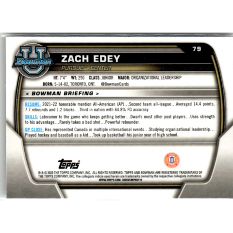 1 kép Topps 2022-23 Bowman Chrome University #79 Zach Edey