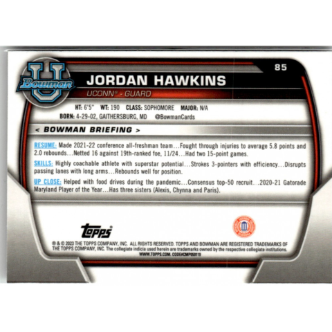 Az eladásra kínált 2022-23 Bowman Chrome University #85 Jordan Hawkins kosaras kártya NM-MT állapotban van. A kosaras kártyákat legtöbb esetben UP Platinum/Standard puha védőtokban és/vagy UP Toploader (kemény védőtok)-ben küldjük. Az eladásra kínált