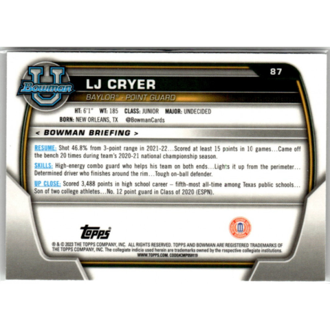 Az eladásra kínált 2022-23 Bowman Chrome University #87 LJ Cryer kosaras kártya NM-MT állapotban van. A kosaras kártyákat legtöbb esetben UP Platinum/Standard puha védőtokban és/vagy UP Toploader (kemény védőtok)-ben küldjük. Az eladásra kínált 2022-